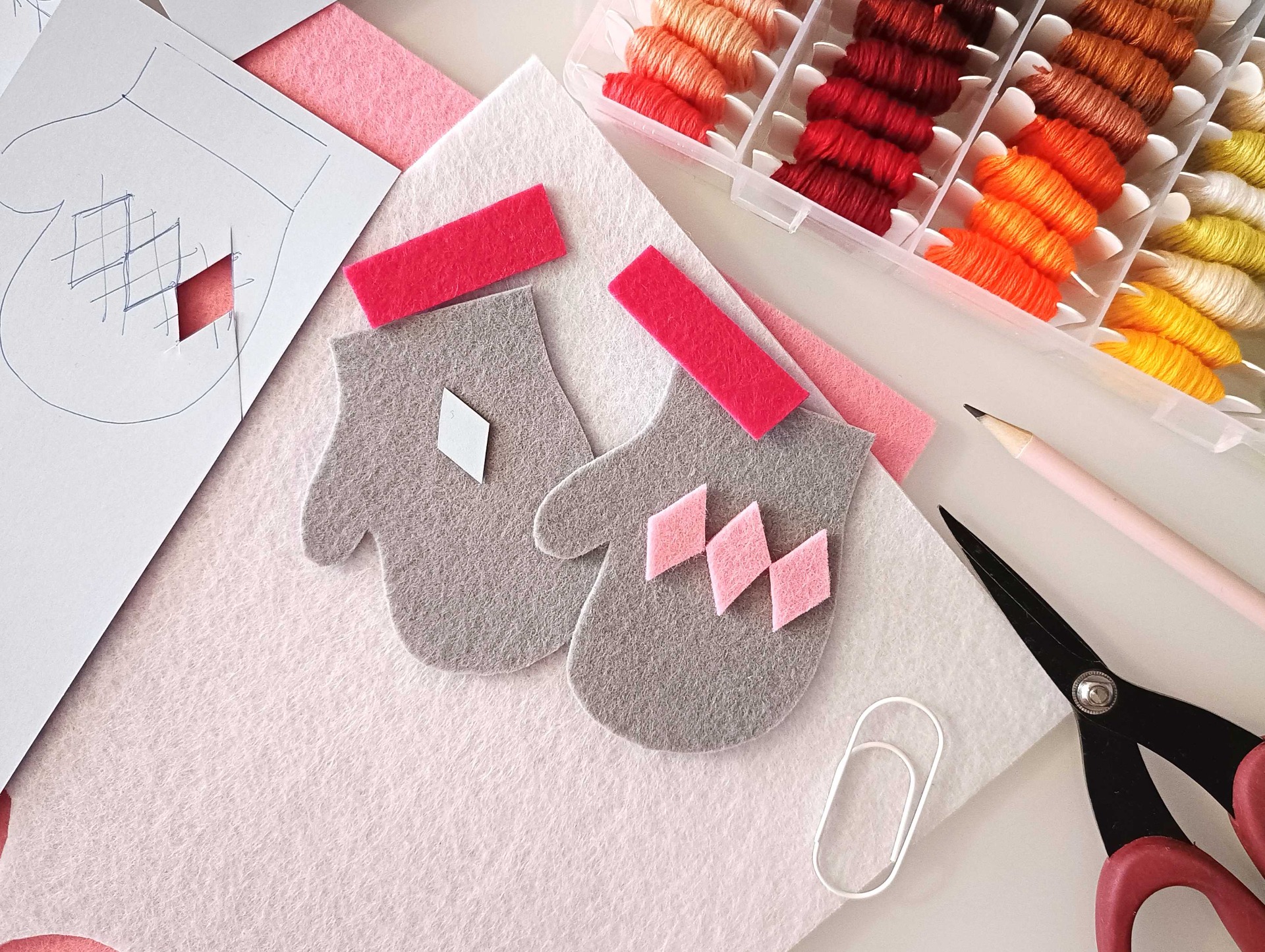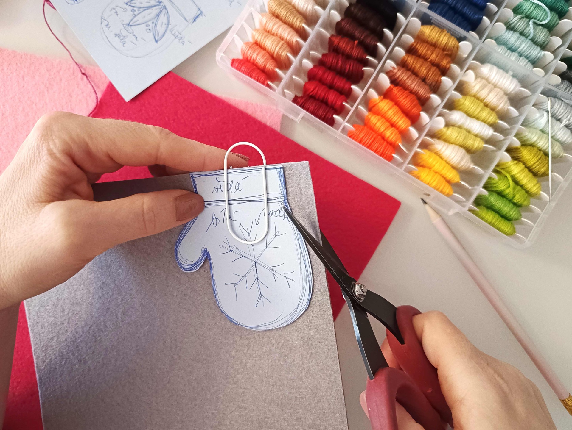 1. Vyberte si, jaké barvy filcu budete kombinovat a najděte k nim i vhodné odstíny bavlnek. Na kousek čtvrtky nakreslete tvar rukavice a vystřihněte, bude to šablona.