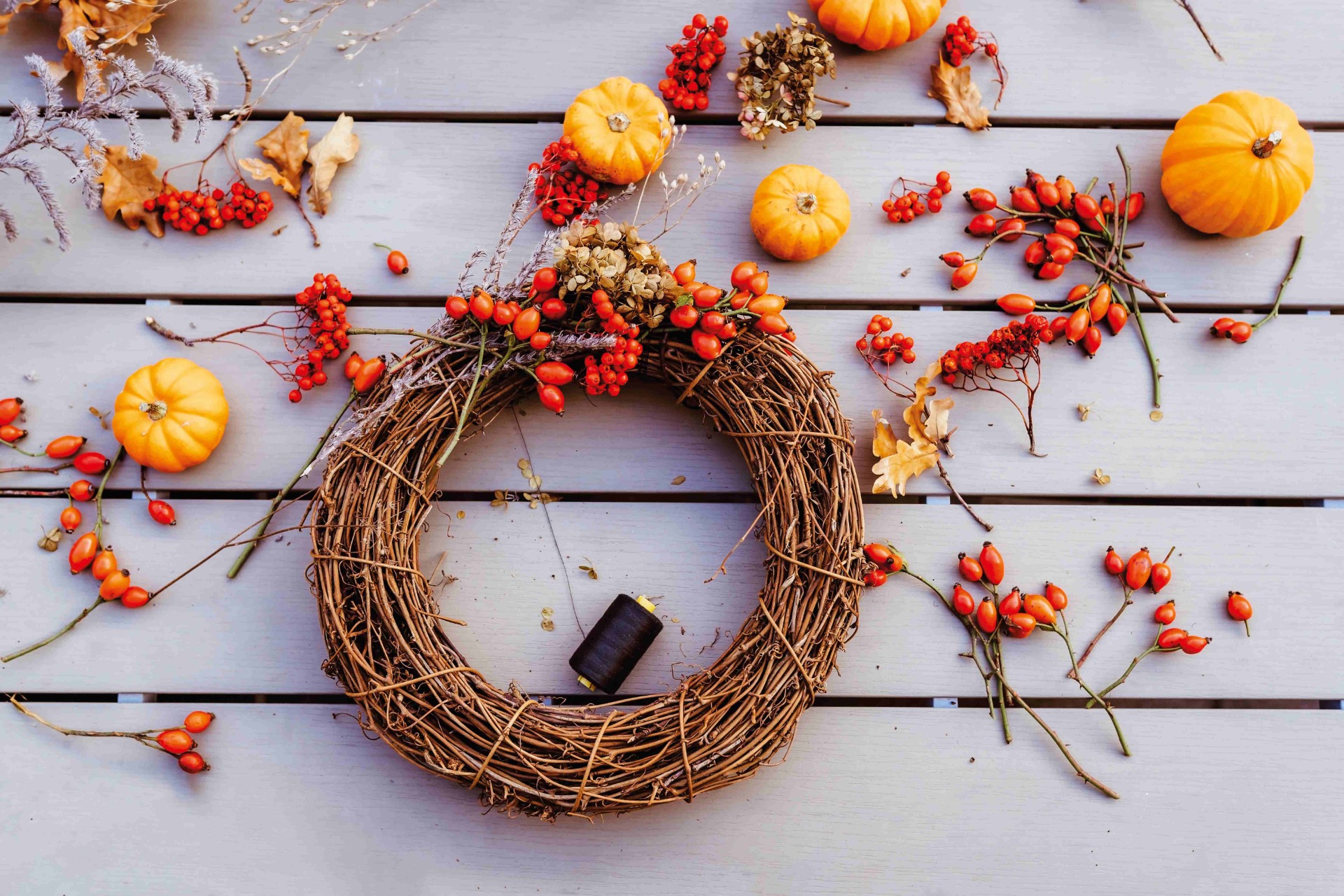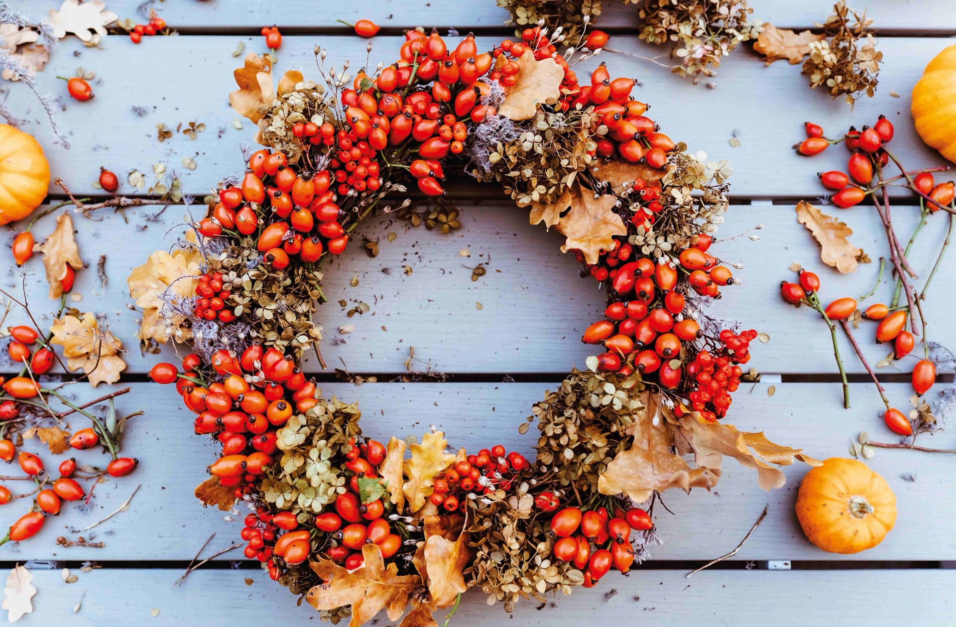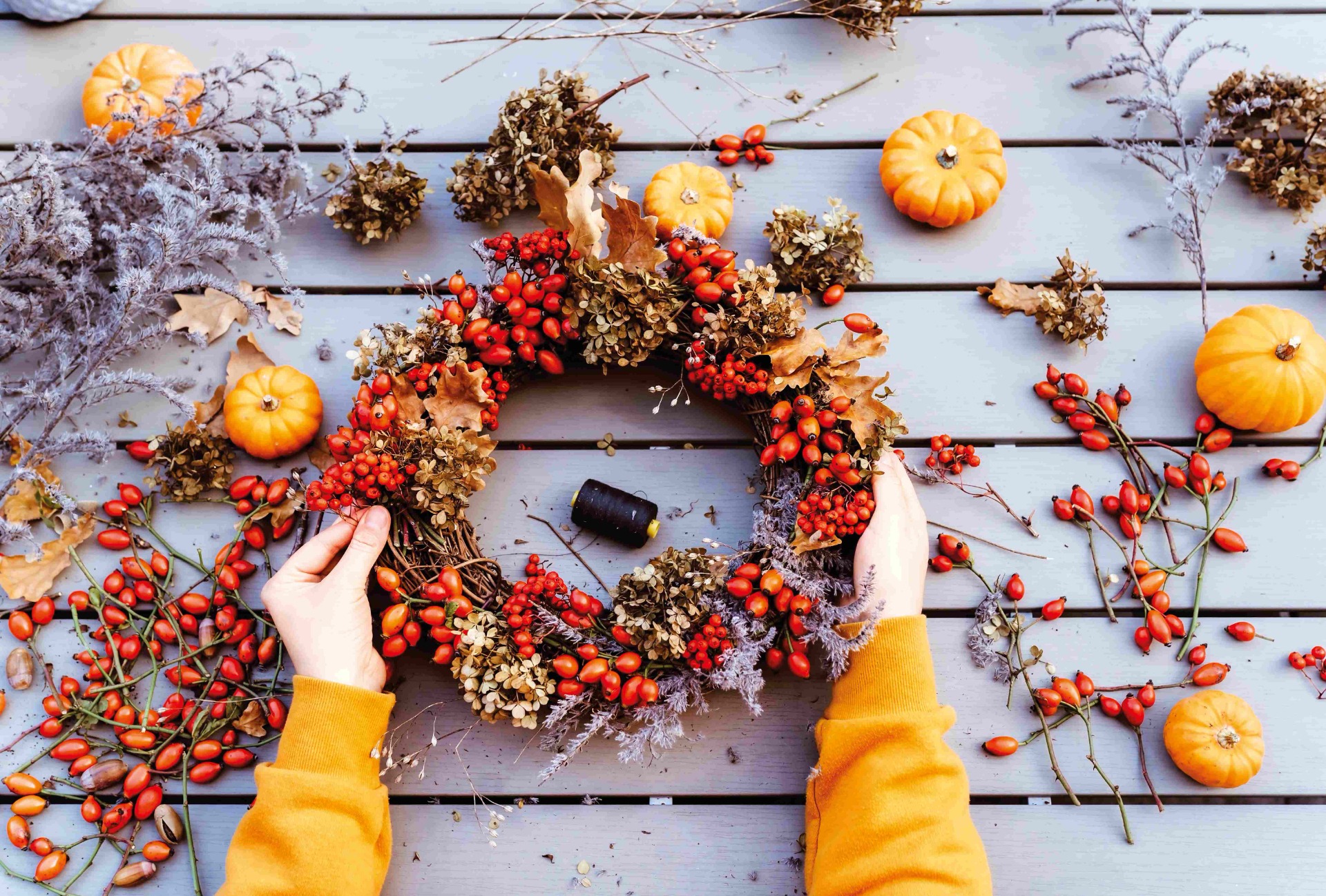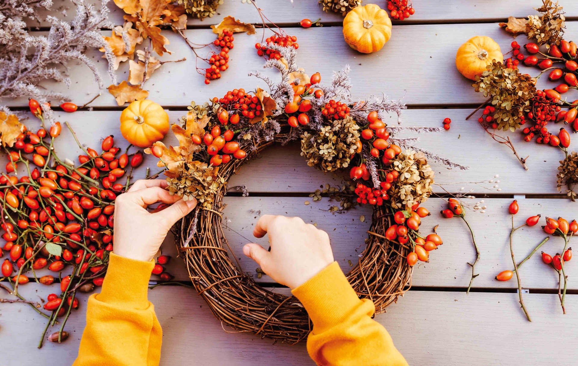 - čerstvé nebo umělé květiny a plody: sušené hortenzie, levandule, klasy, jeřabiny, barevné listy apod.